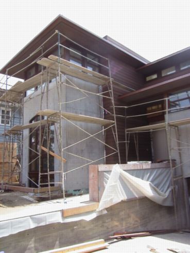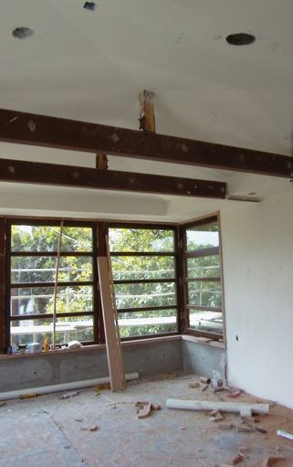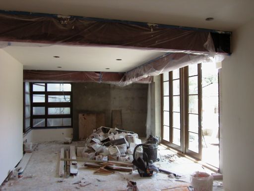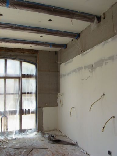 The kitchen; the gray will be covered with "Southern Buff" limestone, the white is the backing for the cabinetry...